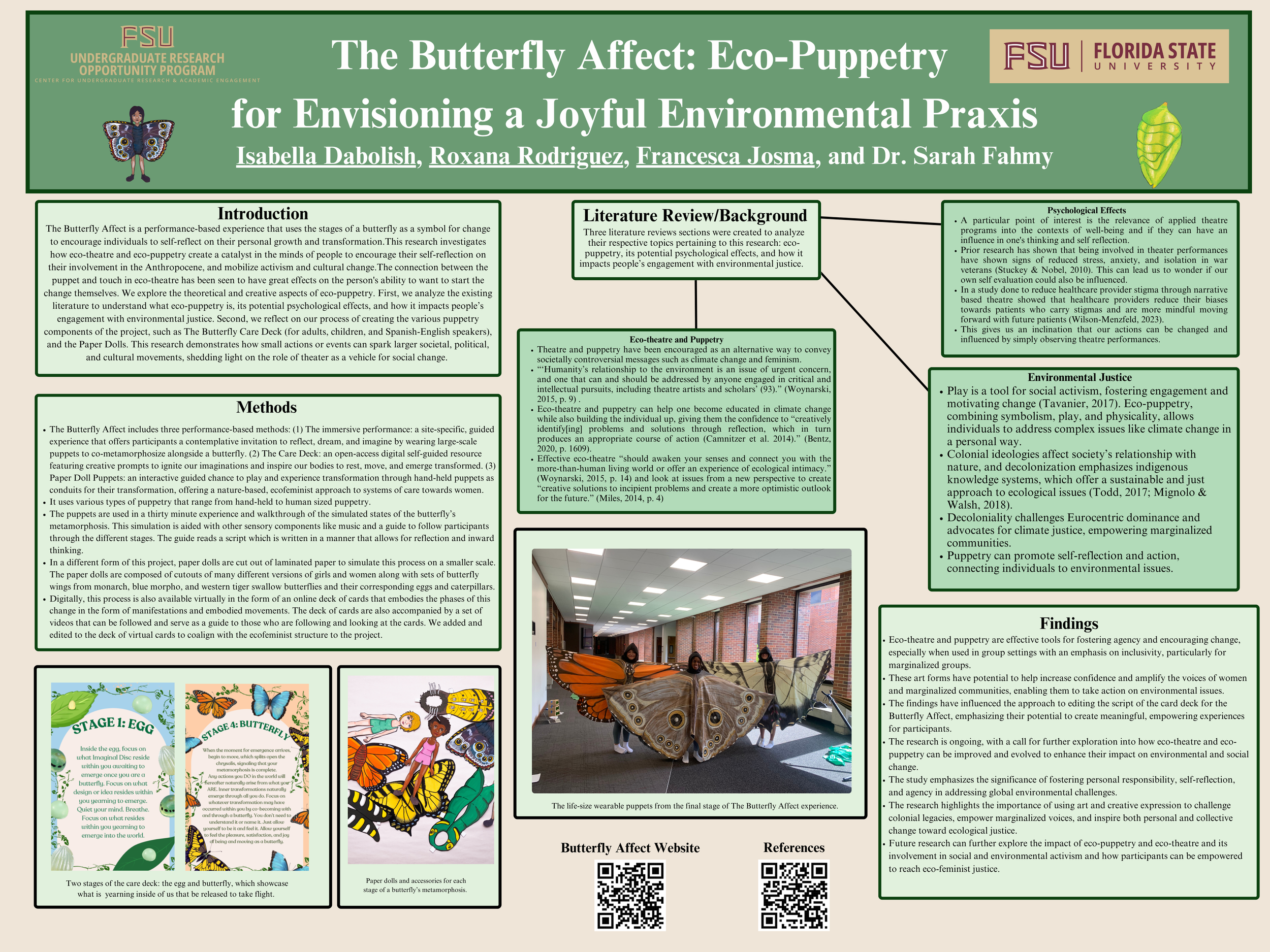 This research is driven by the core belief that “if a dove is the symbol for peace, a butterfly is the symbol for change. Change is inevitable; making it beautiful is a choice.” It centers “affect” as a verb that recognizes continuous action and change. The Butterfly Affect invites individualized self-reflection on personal growth and transformation; wherein participants may recognize themselves as civic agents with the potential for social, political, and cultural impact, capable of co-creating an equitable, survivable, and thrive-able world for all.